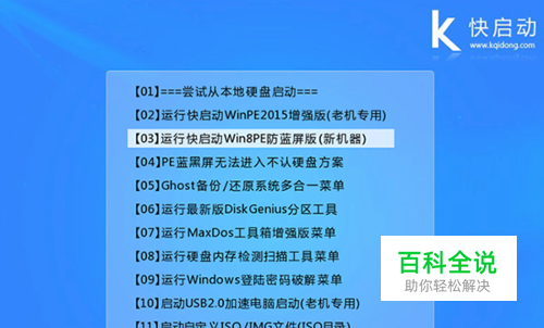 将准备好的快启动u盘插入电脑usb接口,接着开启电脑,等到屏幕上出现开机画面后按快捷键进入到快启动主菜单页面,选择“【03】运行快启动Win8PE防蓝屏版(新机器)”,回车确认,如下图所示: