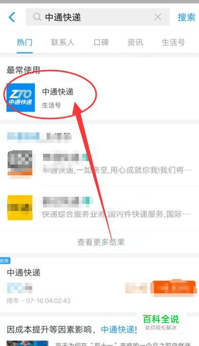 在搜索栏中搜索“中通快递”,点击并进入生活号。