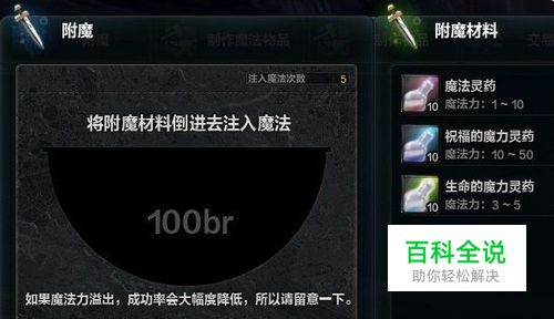每 次附魔的时候,最多只能加5个魔法灵药~关键就是在这5次~一定要注入5次,是的一定要5次~不能少于5次~~不够5次的话到达99br(100br的我 倒是没遇到过)的,90%都会失败的,当然够了5次,溢出了,失败的可能性也是90%,所以遇到这两种情况果断退出,不要心疼你的灵药,因为你点下去的时 候损失将会更大