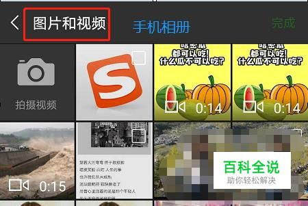 再次点击左侧的图片标志进入到图片和视频选择页面,这次我们点击视频文件(视频文件右上角没有选择框),直接点击视频以后在弹出的页面右上角点“完成”,如下图