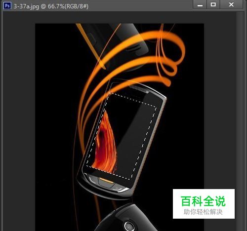 Step02创建选区 确认3-37a为党建图像编辑窗口,选区多边形套索工具,在工具属性栏上设置“羽化”为0px,并沿着手机屏幕创建选区,如下图所示。