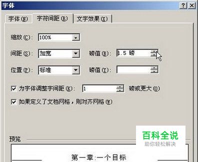 第2步,打开“字体”对话框,切换到“字符间距”选项卡。在“间距”下拉列表中选择字符间距的类型(例如选择“加宽”)。在“磅值”文本框中选择或输入字符间距的数值(例如“1.5磅”)。设置完毕单击“确定”按钮即可,如图2009111004所示。 图2009111004 在Word2003“字体”对话框中设置字符间距