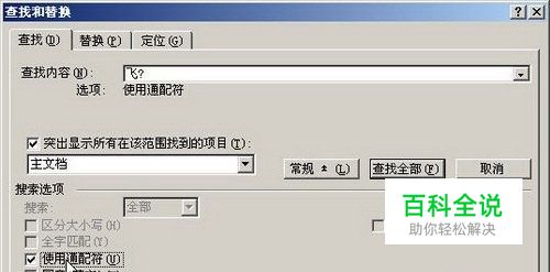 第2步,打开“查找和替换”对话框,在“查找”选项卡的“查找内容”编辑框中输入“飞?”(需要注意的是必须输入英文状态下的问号)。然后单击“高级”按钮,分别选中“突出显示所有在该范围找到的项目”和“使用通配符”复选框,并单击“查找全部”按钮,如图2011061802所示。 图2011061802 “查找和替换”对话框