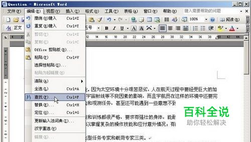 第1步,打开Word2003文档窗口,依次单击“编辑”→“查找”菜单命令,如图2011061801所示。 图2011061801 单击“查找”菜单命令