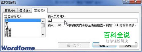 第2步,打开“查找和替换”对话框,在“定位”选项卡的“定位目标”列表中选择“页”选项,然后在“输入页号”编辑框中输入目标页码,并单击“定位”按钮即可,如图2010081220所示。图2010081220 “定位”选项卡