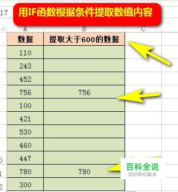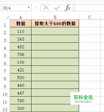 以下图数据为例演示操作方法。在此数据中要把大于600的数值提取到右侧B列中。