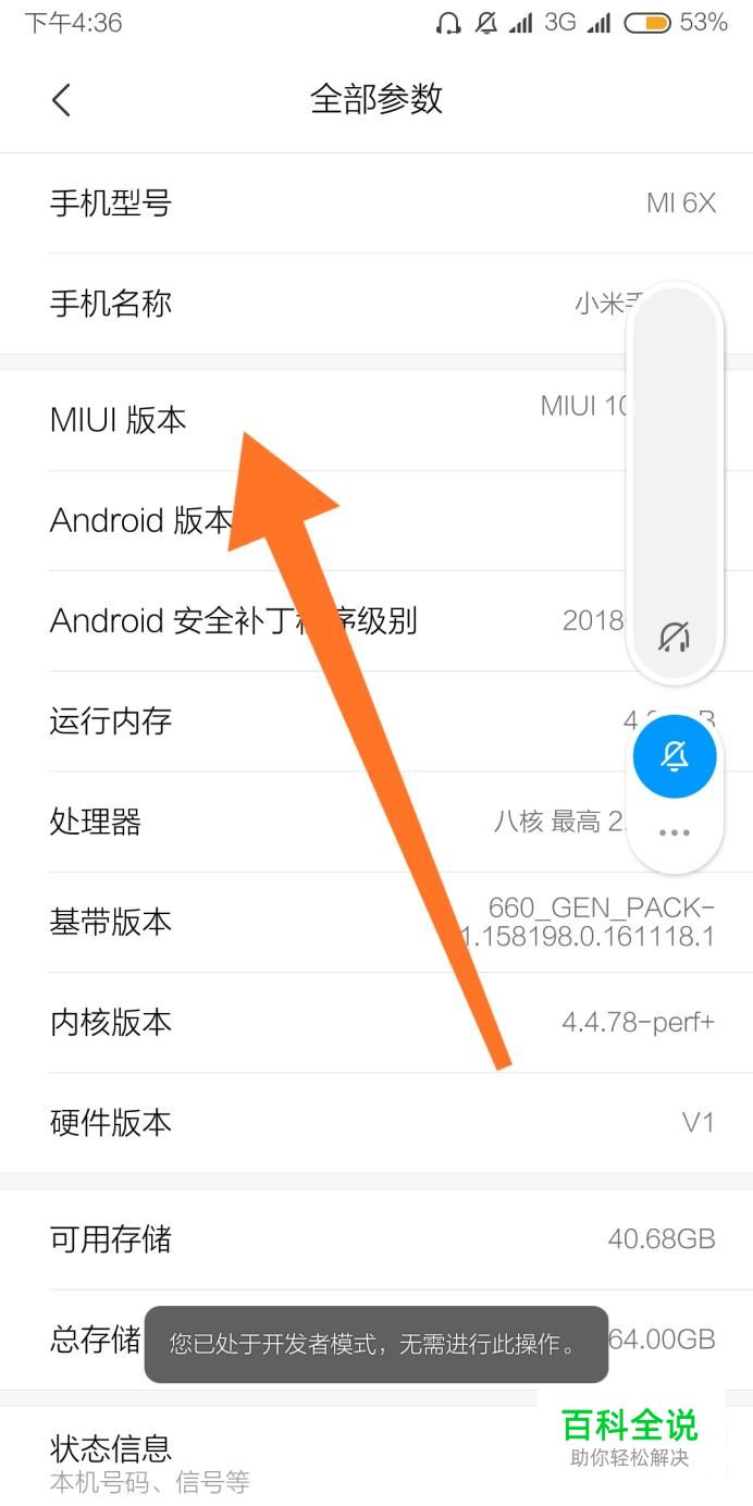 接着连续点击“MIUI版本”,直到手机屏幕提示手机已经进入开发者模式。