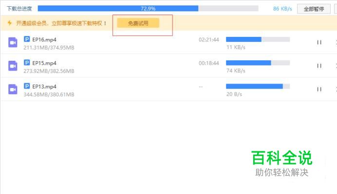 点击上方的免费试用,可以提高百度网盘下载资源的速度,如图。
