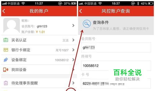在“我的账户”界面中点击“风控查询”,跳转至风控账户查询界面。会员账号和终端号会自动生成,用户只需输入需查询的银行卡号。点击“提交查询”后查看查询结果。
