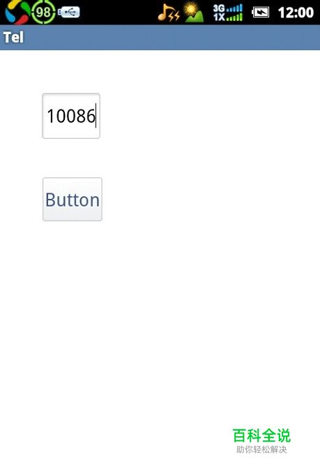Activity对应的xml的布局 <RelativeLayout xmlns:android="http://schemas.android.com/apk/res/android" xmlns:tools="http://schemas.android.com/tools" android:layout_width="match_parent" android:layout_height="match_parent" android:paddingBottom="@dimen/activity_vertical_margin" android:paddingLeft="@dimen/activity_horizontal_margin" android:paddingRight="@dimen/activity_horizontal_margin" android:paddingTop="@dimen/activity_vertical_margin" tools:context=".MainActivity" > <EditText android:id="@+id/telNo" android:layout_width="wrap_content" android:layout_height="wrap_content" android:layout_alignParentLeft="true" android:layout_alignParentTop="true" android:layout_marginLeft="25dp" android:layout_marginTop="26dp" /> <Button android:id="@+id/btn" android:layout_width="wrap_content" android:layout_height="wrap_content" android:layout_alignLeft="@+id/telNo" android:layout_below="@+id/telNo" android:layout_marginTop="37dp" android:text="Button" /> </RelativeLayout>