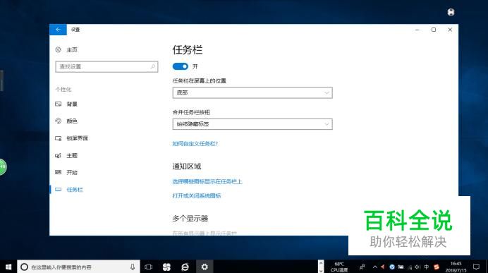 唤出"任务栏"设置选项,如图所示。拖动右侧垂直滚动条,点击"通知区域→打开或关闭系统图标"按钮。
