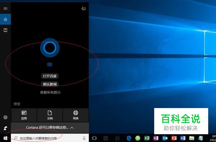 启动Windows 10操作系统,如图所示。点击任务栏搜索框,开始使用Cortana(小娜)智能语音助理。