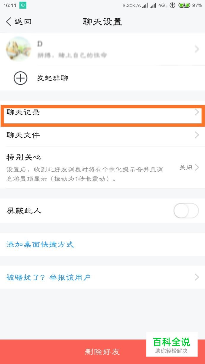 然后就进入了聊天设置界面,请注意在这个界面里面有删除好友选项,请勿误点,点击聊天记录。
