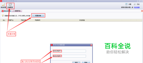 输入账号名和密码点击保存,在选择店铺选项中选择已配置好的店铺,也可以在起始页中配置店铺