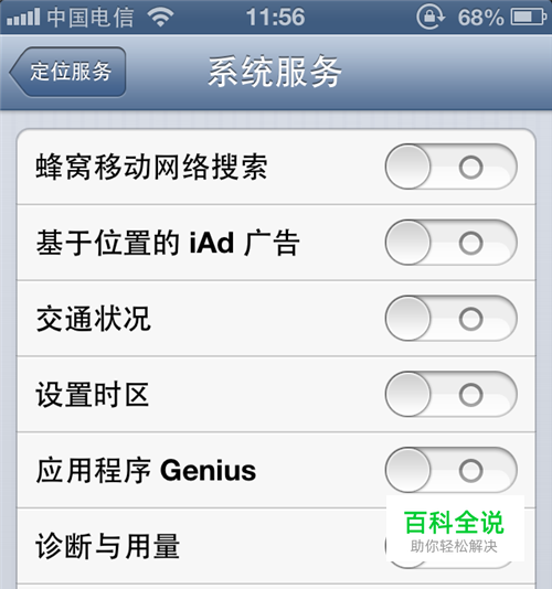 依次打开设置--隐私--定位服务---系统服务(在最下面),除了最后一个指南针校准之外全部关掉,这些都是没什么实际用处的东西,如果不关掉的话,手机GPS会一直发送和接收数据,非常非常耗电。