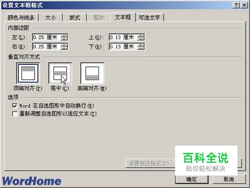 第2步,在打开的“设置文本框格式”对话框中自动切换到“文本框”选项卡,在“内部边距”区域设置文本框边距,然后在“垂直对齐方式”区域选择顶端对齐、居中或底端对齐方式。设置完毕单击“确定”按钮,如图2009010402所示。图2009010402 “文本框”选项卡