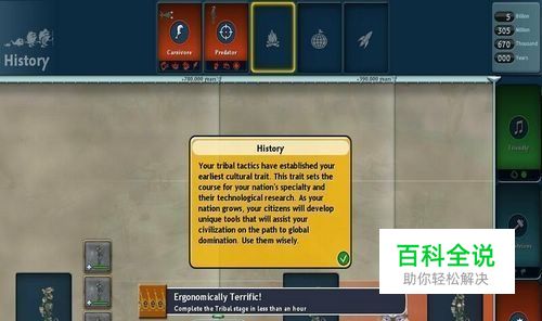 攻陷了淡紫部落,图腾终于完成了。现在进化到文明阶段吧。恭喜,你的部落已经是最高统治者了。想要进化的时候就点击右下角那个该死的进化按钮。 点击此处进化到文明阶段,进入文明阶段之前要编辑属于你的城堡和载具,这个我们下回分解。 恭喜。你在部落阶段采取的策略决定了你的早期文明特性。这个特性将会决定你的国家特性以及科技的发展状况。当你的国家壮大时,你的国民将逐步开发出各种工具以及逐步形成遍布全球的文明,尽可能地使用它们吧。