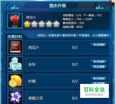 酒水升级需要消耗一定的钞票和数种材料 酒谱:派对中喝该种酒水有机会掉落; 其他材料:通过好友赠送或收集吸血鬼评价掉落;