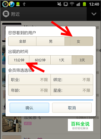 只关注女生。每天看着蓝色发射的箭头,我想你也会感到不舒服。还是粉红色接收的圆圈好看点。点击页面右上角向下的三角标,打开搜索控制框,这这个对话框中就可以选择只想看到女性。建议的设置是选择女,和出现的时间15分钟,这可以让你最大限度的让你和你希望勾搭的女生正面勾搭上,不然可能你发送的信息你的女神后天才能看到也不一点。