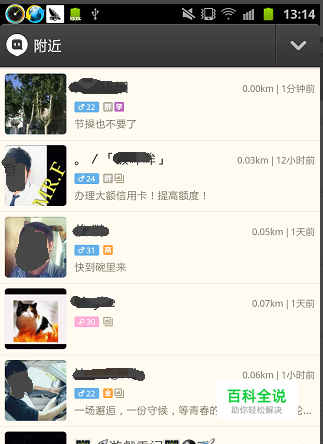 选择完搜索条件后点击确认按钮,这是页面显示的就是你想要的结果了,全部都是粉红色圆圈,虽然还是有马赛克,但是至少看上去比之前的舒服点了。注意此页面上的头像是按照由近及远的方式排列的,越靠前代表和你越近。