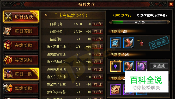 在9377奇迹来了网页游戏中,玩家每完成一个任务、副本、活动,都可获得或多或少的活跃度。当日的活跃度达到80、150、230、310时,即可领取对应的活跃度奖励。那么奇迹来了活跃度奖励有哪些道具呢这些道具有什么用处呢? 先来看看各个奇迹来了活跃度奖励的具体内容: 活跃度80,可领取双倍经验卷轴1、传送符20、小型生命精华1。 活跃度150,可领取祝福宝石1、传送符40、1万魔魂2。 活跃度230,可领取觅宝图1、1000绑定钻石1、中型生命精华1。 活跃度310,可领取欢乐镶嵌宝石箱3、灵魂宝石1、极冰卷轴1。 接下来我们对这些活跃度奖励进行详细解析: 双倍经验卷轴:使用后打怪经验提高100%,持续60分钟。 传送符:右键点击超链接,可以瞬间到达。成为VIP1可以免费传送。 小型生命精华:每5秒回复生命值上限的10%,容量为240000。 祝福宝石:装备提升属性的神石,可提升装备的基础属性。 1万魔魂:使用后可增加10000点魔魂。奇迹来了官爵升星与技能升级需要消耗魔魂,是变强路上不可或缺的材料。 觅宝图:开启宝藏的必备材料。只可在单次挖宝中使用。 1000绑定钻石:使用后可以获得1000绑定钻石。 中型生命精华:每5秒回复生命值上限的15%,容量为720000。 欢乐镶嵌宝石箱:使用后随机获得1-3级攻击宝石、防御宝石、生命宝石中的一个。 灵魂宝石:强化装备神石,强化+6以上必须使用灵魂宝石才能够进行强化。 极冰卷轴:进入奇迹来了极冰之地必备材料。进入极冰之地,击杀极冰怪物可掉落装备进阶材料。