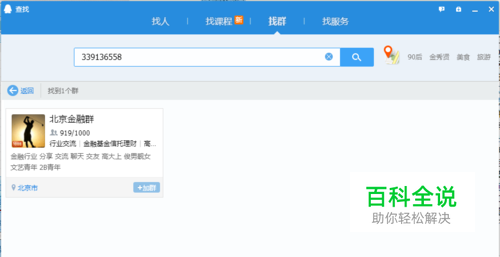 在右上角小方框里输入你要加的相关群的关键词,然后点开始搜群按钮,这样我们要加的相关的目标QQ群就被我们找出来了。