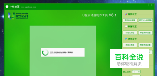 安装完毕后,插入u盘制作u盘的启动盘,按默认的设置即可,然后在制作之前可以点击个性化设置,进行字体,启动时间和背景图片的选择。然后制作就行了。