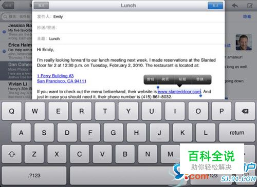 Multi-Touch 屏幕可让您轻松地更改您所输入的文本。屏幕放大镜可帮助您将插入点精确地放置到期望位置。所选文本上的抓取点可让您快速地选择更多或更少的文本。您也可以在应用程序内或在多个应用程序之间剪切、拷贝和粘贴文本与照片。