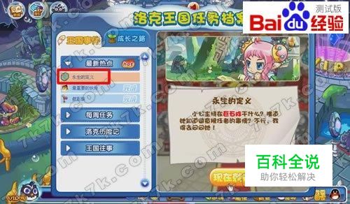 《洛克王国》是腾讯公司专门为儿童打造的一个在线绿色社区,社区以魔法王国为主题,小朋友可以在里面体验趣味小游戏,学习丰富的百科知识,还可以和其他小朋友一起交流玩耍。互助、欢乐、绿色是社区的主题。孩子们将化身为一个个小魔法师,在王国里学习魔法、参加兴趣协会、拜访好友、和伙伴们一起做游戏。洛克王国永生的定义是洛克王国新更新的一个任务,那么洛克王国永生的定义任务怎么做呢?接下来,我跟大家一起分享这个任务的攻略。