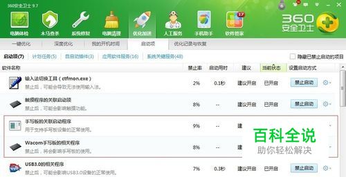 第二种方法:使用杀毒安全软件的用户,在开机项目里找到wacom项修改为开机启动