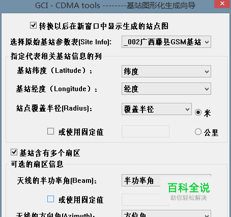 步骤四 通过GCI-CDMA Tools中的基站图形化生成向导,设置好基站的经纬度、覆盖半径、天线波瓣角及方位角等数据即可生成扇区图层的了。基站覆盖半径和天线的半功率角等信息可以在EXCEL数据中设置不同值,也可在该界面中设置统一的值,G网的覆盖半径一般在0.8km—2.0km内,天线波瓣角一般设置为65°。注意:在此界面中基站经纬度的顺序是纬度在前,经度在后的,别选错了哦。