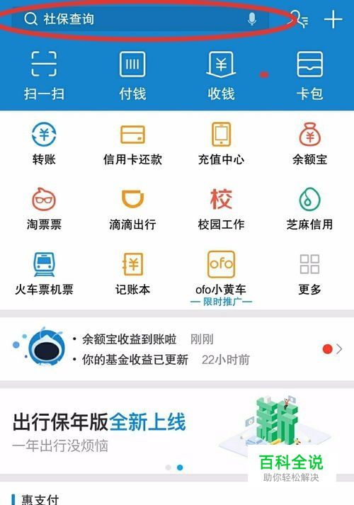 首先打开支付宝点击最上面的搜索栏。