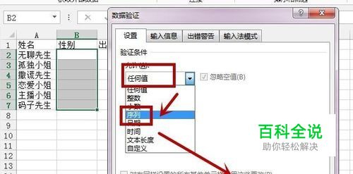 在弹出的数据验证对话框中,选择“序列”,然后确定,如下图