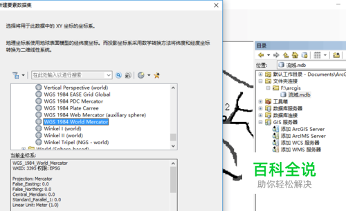 在连接的文件夹下新建个人地理数据库,并创建要素数据集,选择墨卡托坐标系,和WGS84坐标系