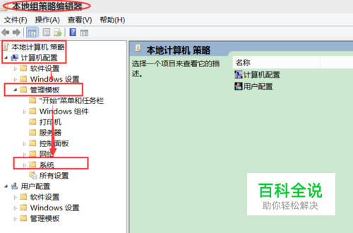 在本地组策略编辑器窗口中,依次选择计算机配置→管理模板→系统。