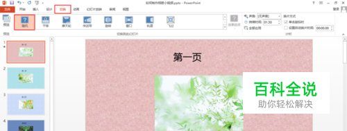 接下来需要确认PPT的播放效果,找到‘切换’选项,然后打开找到‘随机’的这个效果。这个按照自己喜好选择就行。