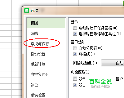 在“选项”窗口中单击左侧的“常规与保存”选项卡。