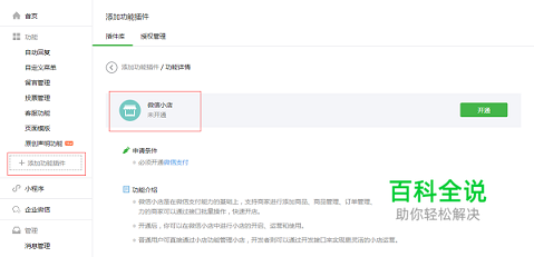 登录公众号,在左侧“功能”-“添加功能插件”处找到“微信小店”。 进入“微信小店”开通页面,点击绿色按钮“开通”。