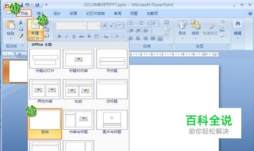 新建幻灯片。操作步骤:开始--新建幻灯片--下拉Office主题选择,这里选择空白就好,因为我们做的PPT还要添加图片,标题和内容较少用。