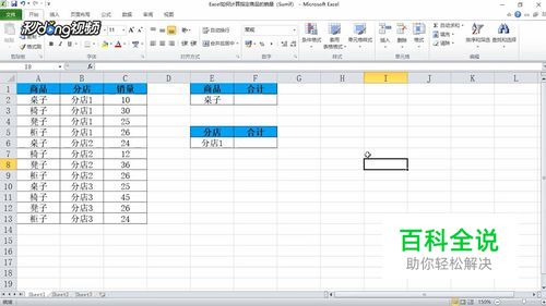 打开excel,以其素材为例,分别计算桌子和分店1的销量。