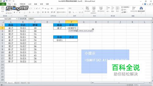 在F2单元格中输入公式计算桌子的销量:=SUMIF(A2:A13,E2,C2:C13)。