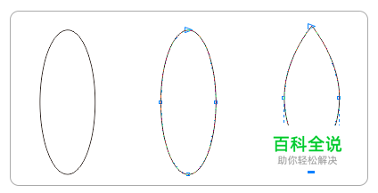 使用“椭圆工具”F7绘制椭圆,然后转曲(Ctrl+Shift+Q),使用形状工具调整手柄、节点,得到下图(右)所示的效果。