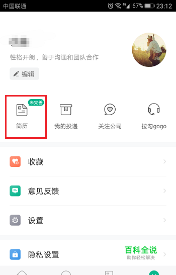 第一步打开软件,进去个人中心界面,点击简历,如下图所示: