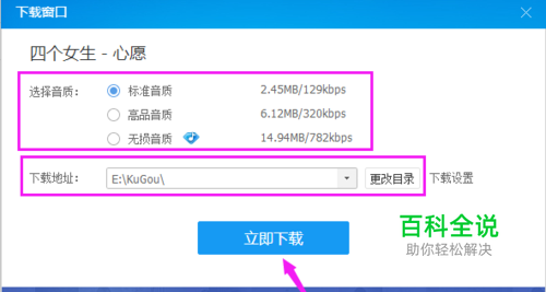 选择自己喜欢的音质,然后设置存储路径(这个就是下载下来后歌曲所存储的位置)。点击【立即下载】