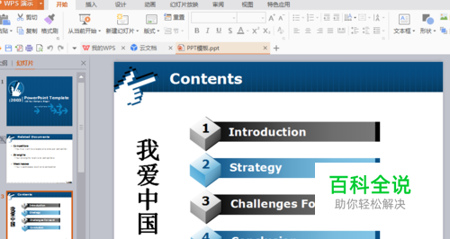 以下图为例,我们在PPT上输入文字竖着排列的【我爱中国】。首先打开PPT,找到需要编辑的目标页。