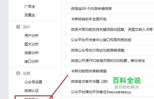 接下来,在公众平台操作页面,点击”安全中心“,然后点击进入相关设置。