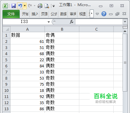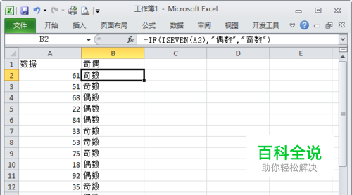 通过一个偶数除2余数为0,奇数余数不为0的规则使用MOD取余函数来判断。 在B2单元格输入公式 =IF(MOD(A2,2)=0,"偶数","奇数") 然后拖动填充柄到指定的区域即可。 如下图所示