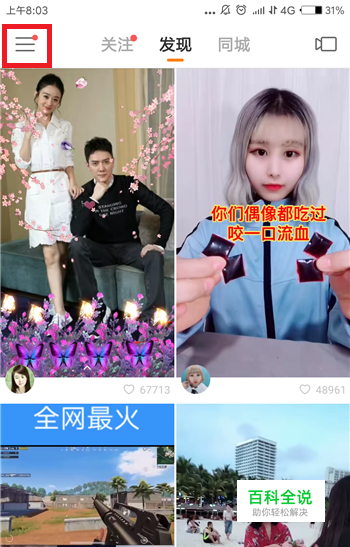 打开手机中的快手,在快手的首页中点击左上角的【三】选项打开更多界面。