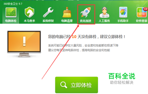 进入360安全卫士首页,点击优化加速