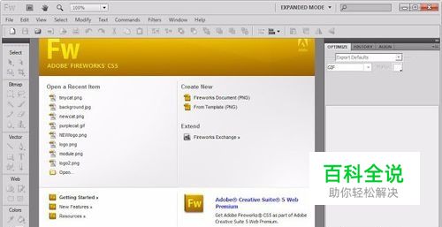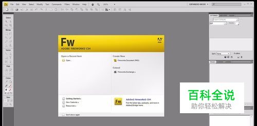 开启fireworks软件之后,我们会进入fireworks的工作页面, fireworks会弹出欢迎页面,在欢迎页面中我们可以进行近期文件的开启或者文件新建。